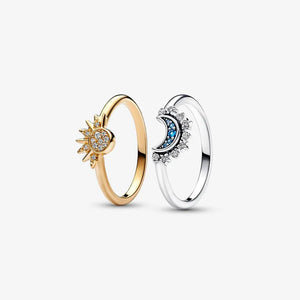 Channel lunar energy with this beautiful Celestial Moon and Star Ring Set. The beautiful Celestial Blue Sparkling Moon Ring is crafted from luminous sterling silver, with a crescent moon motif in the centre filled with deep blue pavé. Sparkling stars surround the outer side of the crescent. Wear it by itself as a symbol of enlightenment, hope and the divine feminine, or stacked together with the 14k gold-plated Celestial Sparkling Sun Ring. The two rings fit perfectly together, representing duality and harmony in nature and within ourselves.
